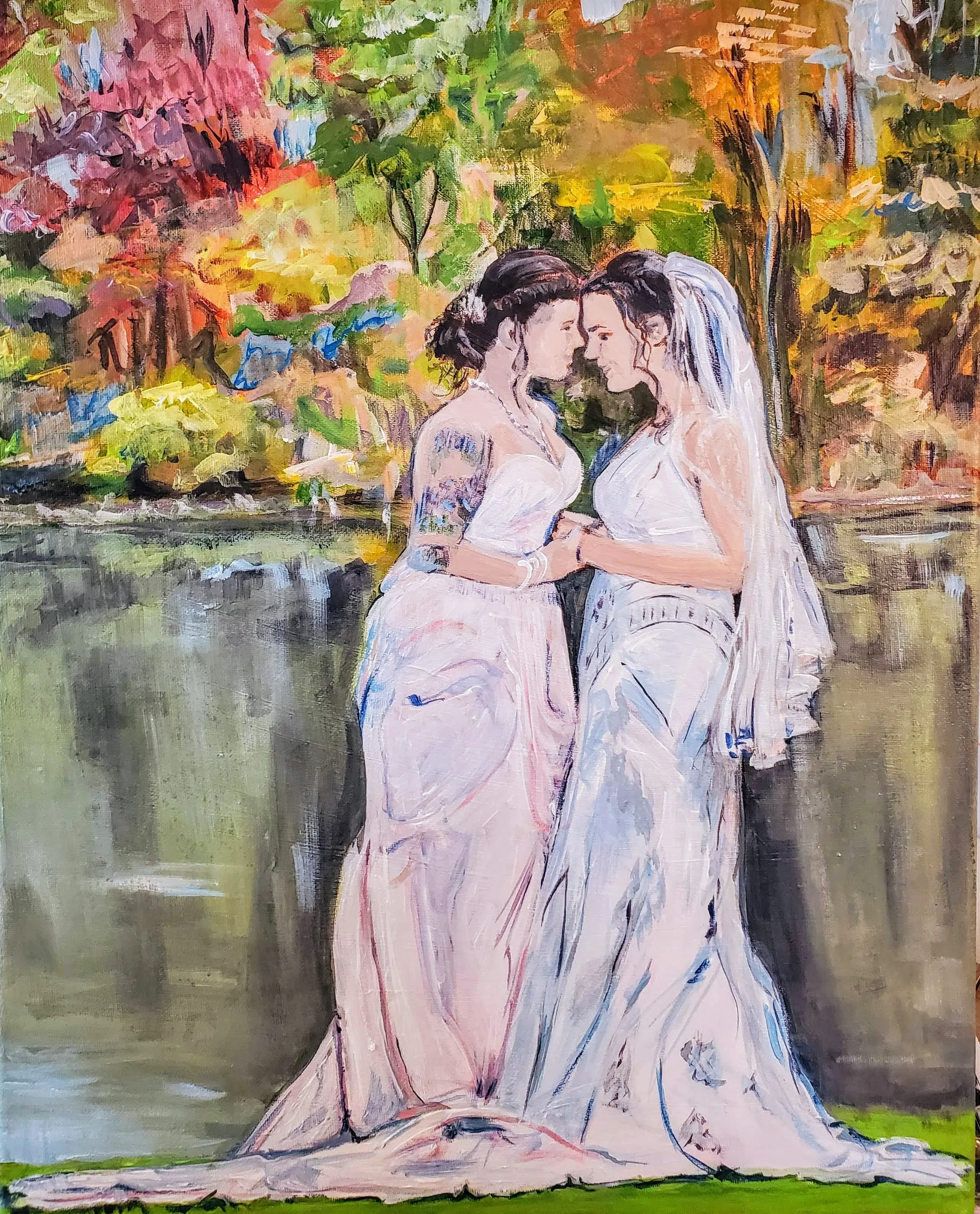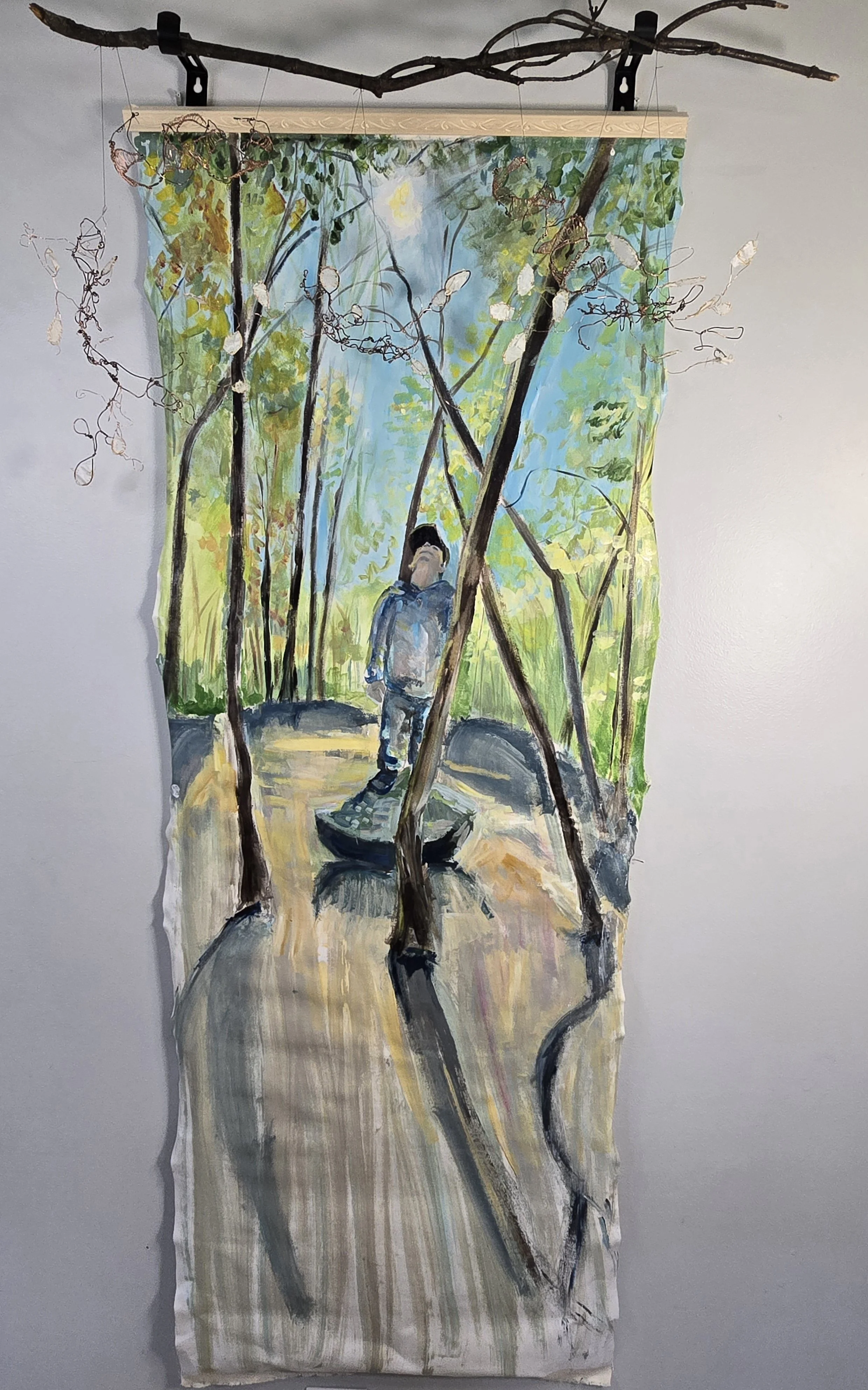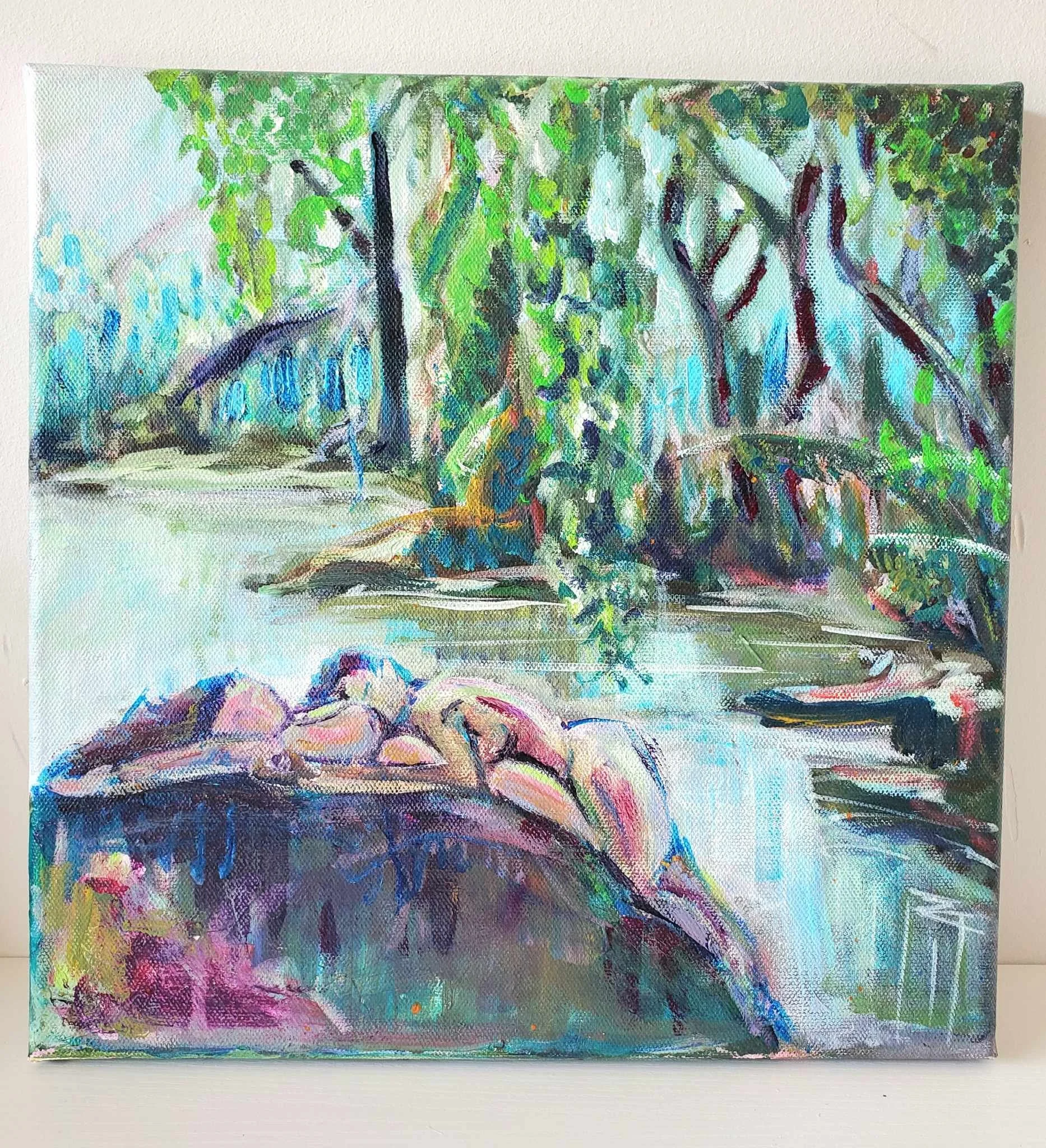 While the purple and aquamarine surround her, slowly turning olive yellow to blue-green, she rests